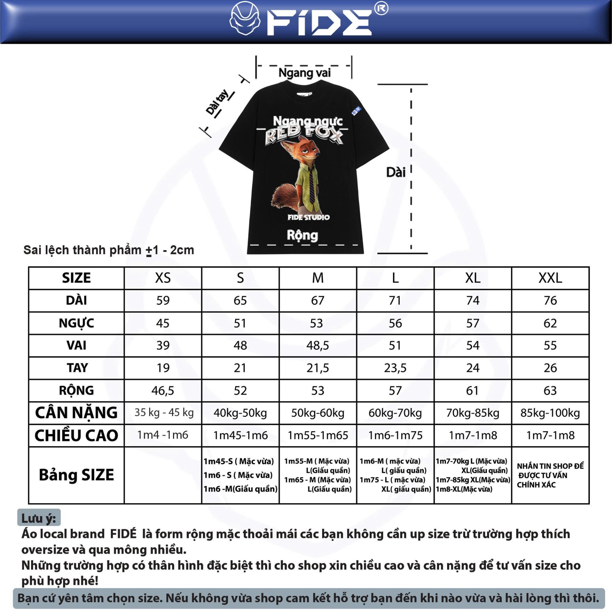 Áo local brand FIDÉ là form rộng mặc thoải mái các bạn không cần up size trừ trường hợp thích oversize và qua mông nhiều Những trường hợp có thân hình đặt biệt thì cho shop xin chiều cao và cân nặng để tư vấn size cho phù hợp nhé!