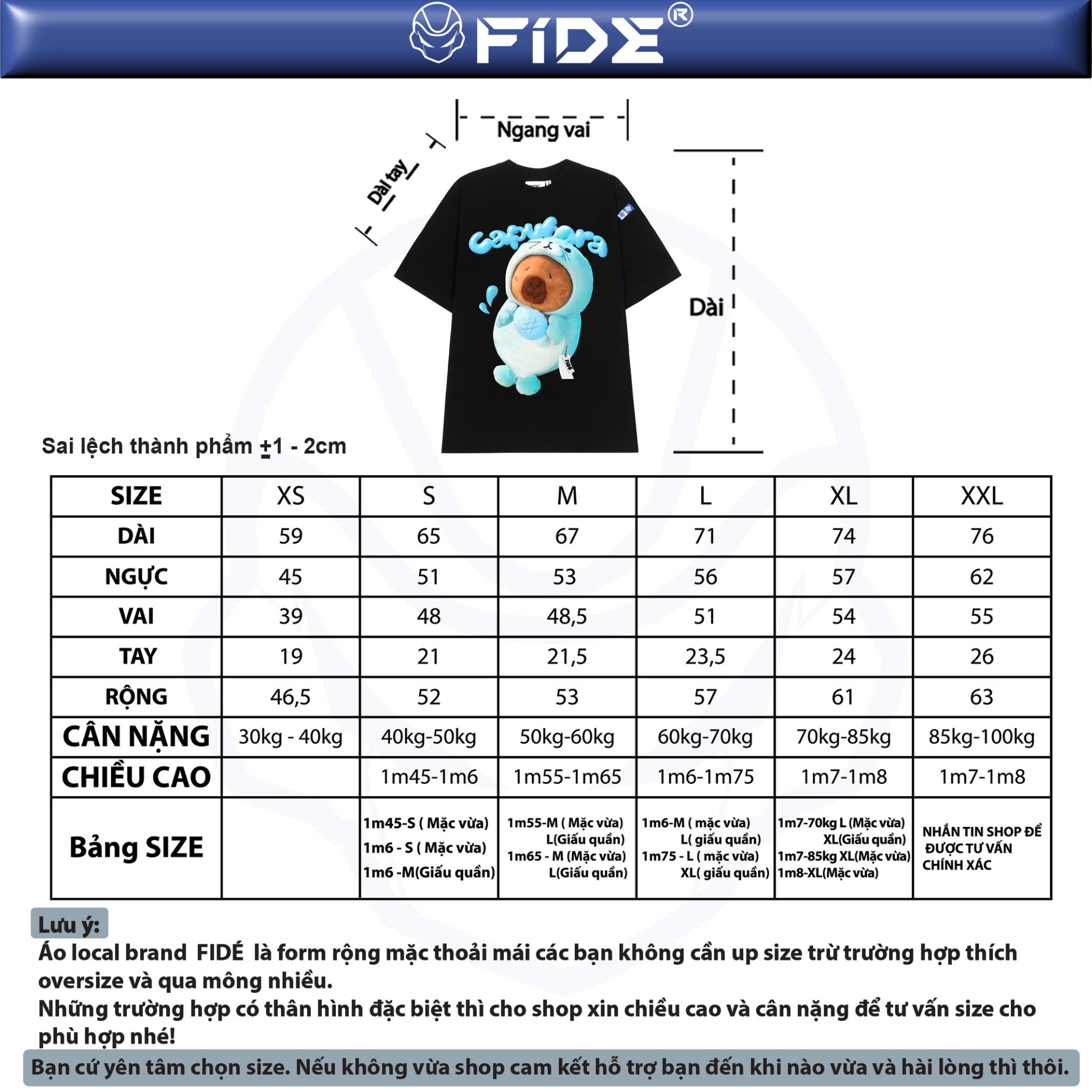 Áo local brand FIDÉ là form rộng mặc thoải mái các bạn không cần up size trừ trường hợp thích oversize và qua mông nhiều Những trường hợp có thân hình đặt biệt thì cho shop xin chiều cao và cân nặng để tư vấn size cho phù hợp nhé!