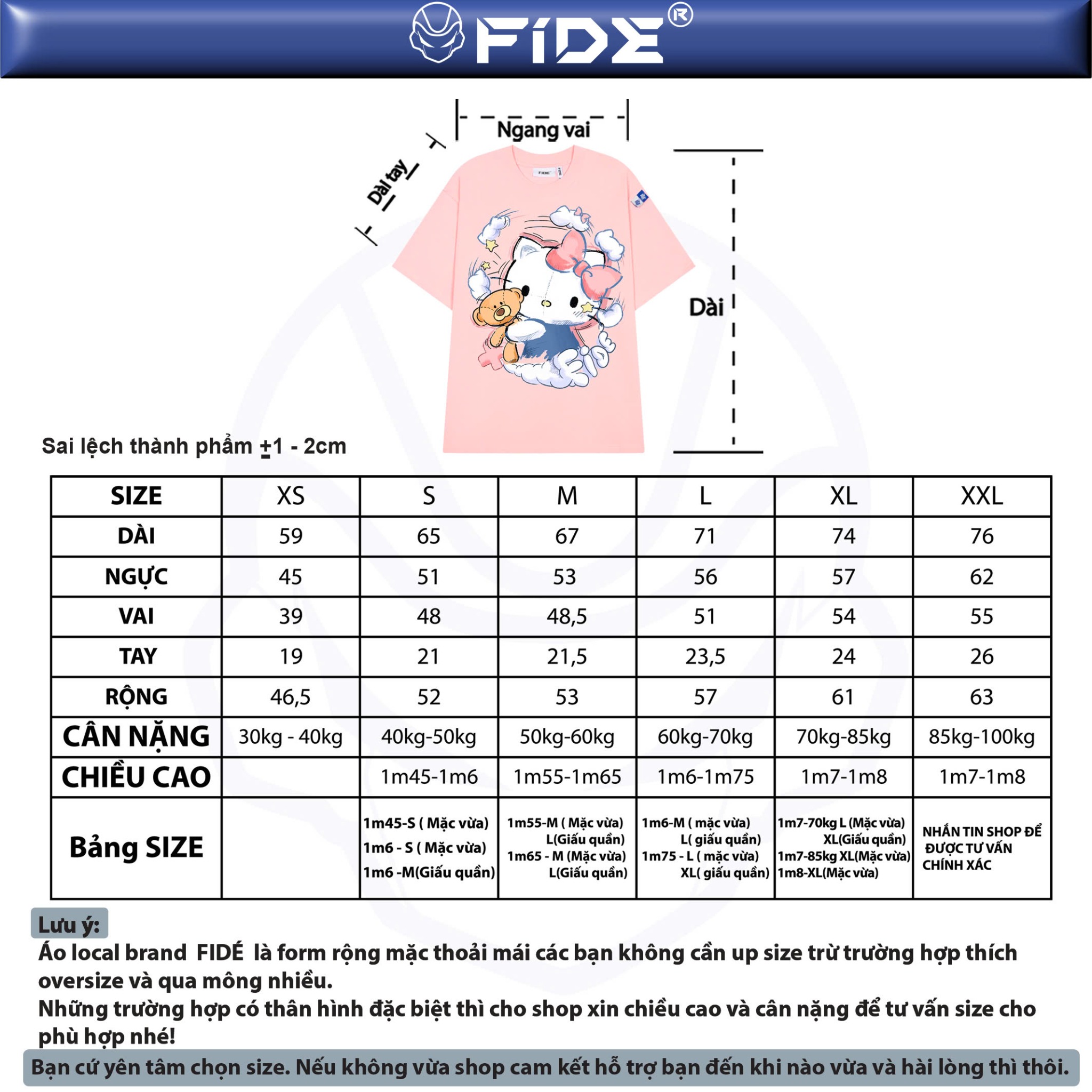 Áo local brand FIDÉ là form rộng mặc thoải mái các bạn không cần up size trừ trường hợp thích oversize và qua mông nhiều Những trường hợp có thân hình đặt biệt thì cho shop xin chiều cao và cân nặng để tư vấn size cho phù hợp nhé!